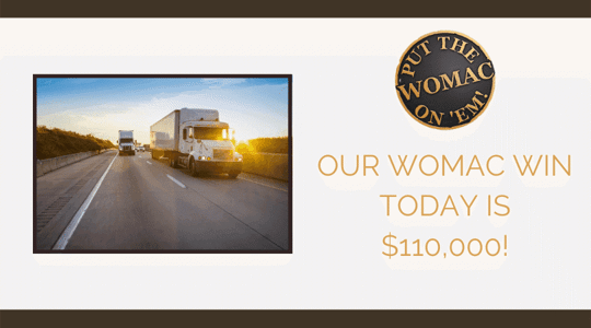 We recently represented a female client who was injured when an 18 wheeler sideswiped her vehicle. She injured her neck and underwent one injection for her injury. We put the Womac on em and recovered $110,000.
